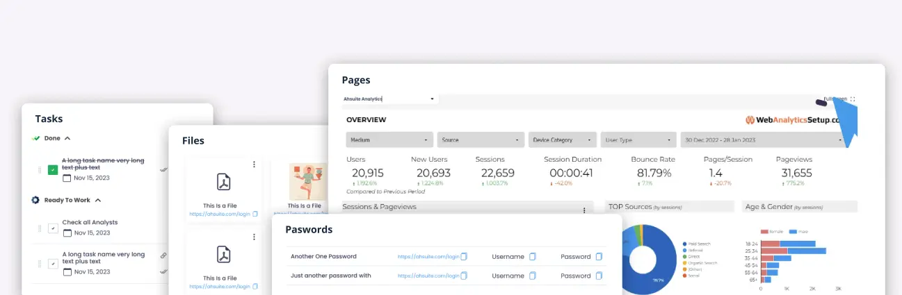 Give your clients a comprehensive view of your work by sharing videos, dashboards, designs, forms, and more—all within Ahsuite’s client portal. Customize the portal to suit each client’s needs, making it easy for them to access the information that matters most. With everything neatly organized in one place, your clients stay informed and engaged without the hassle of back-and-forth emails.